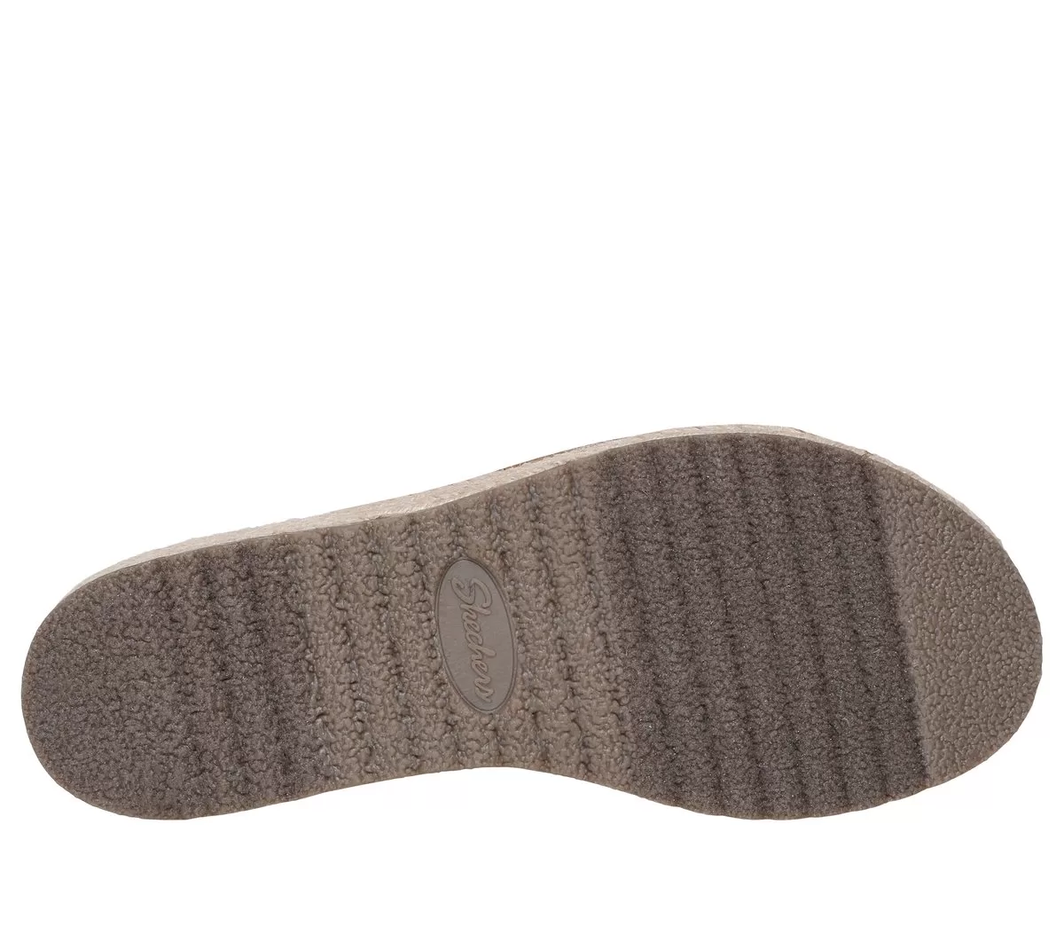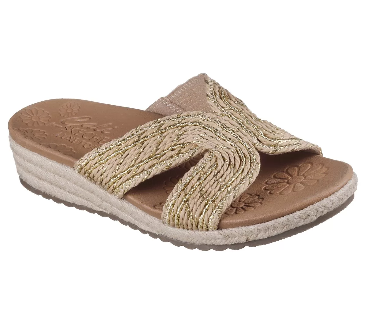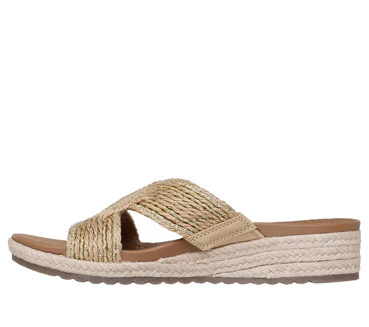 Sommerlicher Style und höchster Komfort vereinen sich im Skechers Cali® Breezie – Shimmer Waves. Diese vegane Keilsandale verfügt über ein metallisches H-Band-Obermaterial aus Jute, eine Espadrille-Zwischensohle mit Jutebesatz und ein gepolstertes Luxe Foam®-Fußbett.
