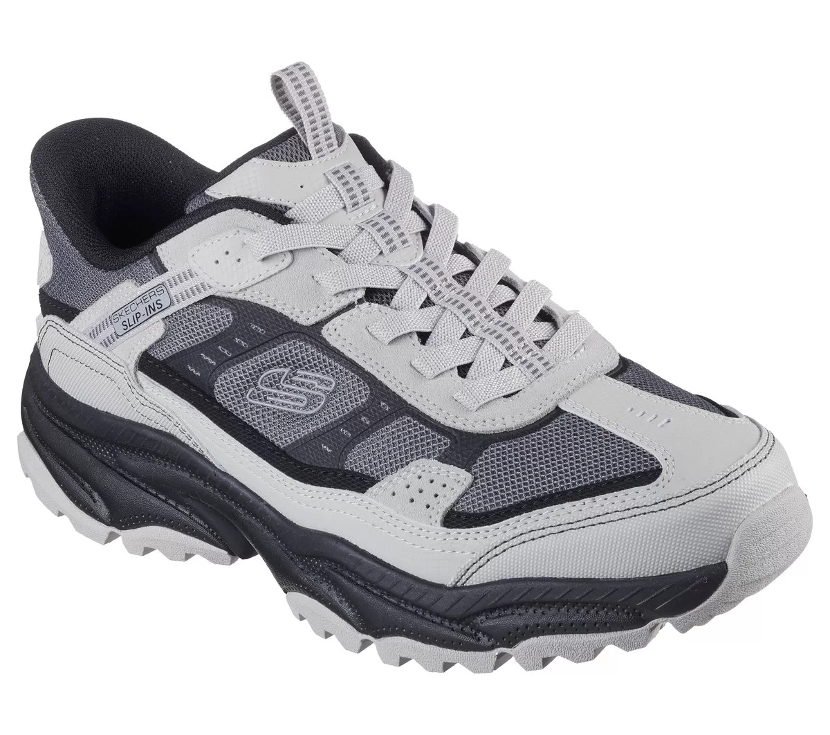 Gehen Sie bequem mit den Skechers Hands Free Slip-ins® : Vigor AT auf die Trails. Dieses Outdoor-Trail-Design verfügt über ein Obermaterial aus Leder und Synthetik mit elastischen Schnürsenkeln, eine Skechers Air-Cooled Memory®-Einlegesohle und eine robuste Traktionslaufsohle.