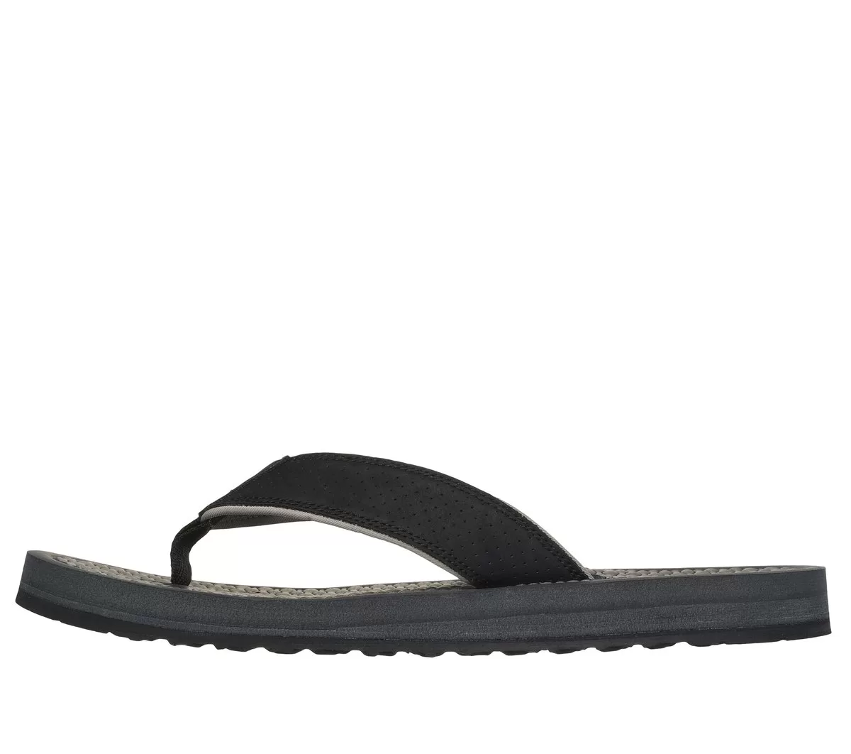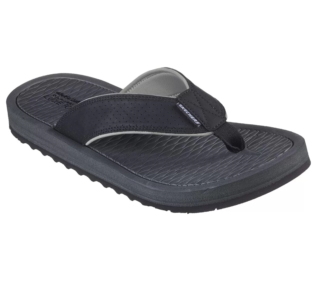 Erreichen Sie Entspannung pur mit Skechers Relaxed Fit®: Tantric – Copano. Diese geräumige 3-Punkt-Zehentrenner-Sandale verfügt über ein perforiertes Obermaterial aus Kunstleder mit einem konturierten Luxe Foam®-Fußbett.