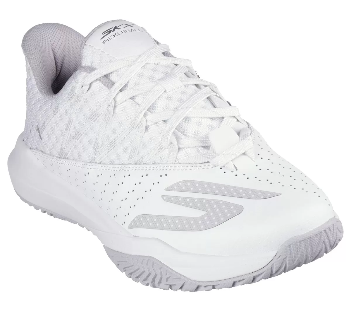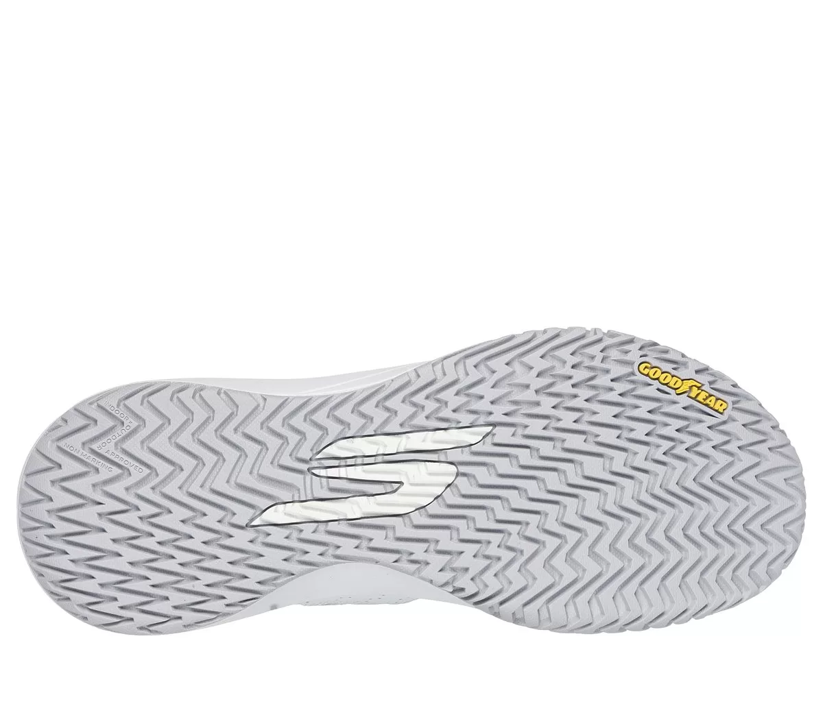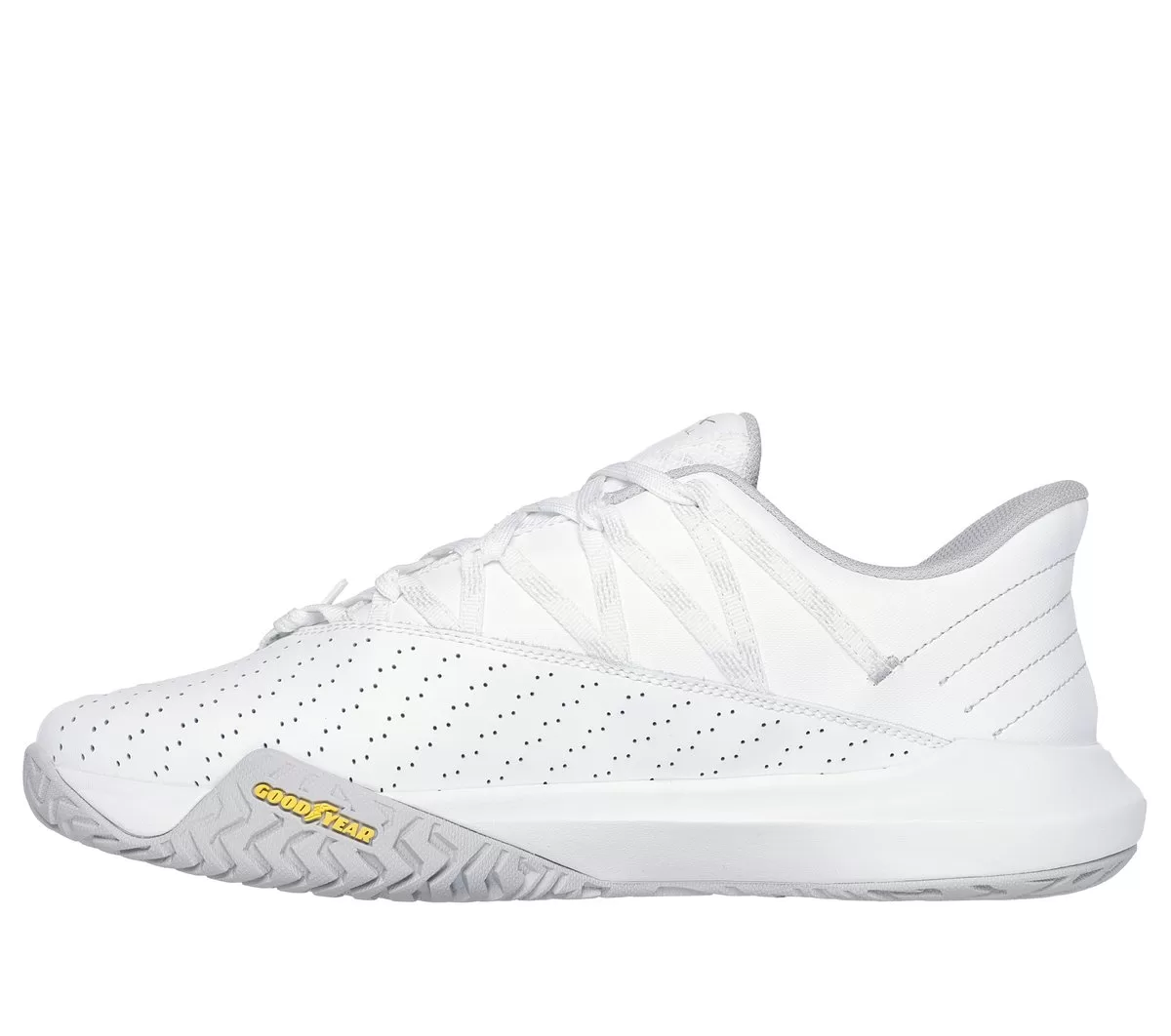 Steigern Sie Ihr Spiel mit Skechers Viper Court Rally™. Dieser Pickleball-Schuh mit Schnürung verfügt über ein Obermaterial aus Mesh und perforiertem Leder sowie eine leichte Move Foam™-Einlegesohle. Abgerundet wird das Design durch eine Laufsohle aus Goodyear® Gold-Compound, die für erhöhte Haltbarkeit sorgt, damit auch Elitespieler kontrollierte Slides speziell auf dem Pickleball-Court-Belag ausführen können.