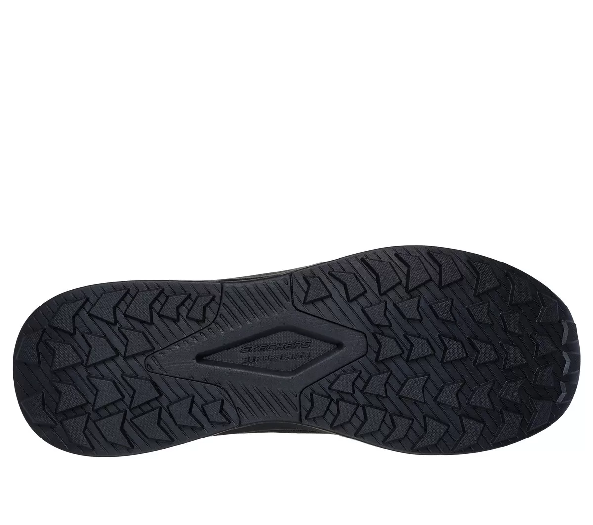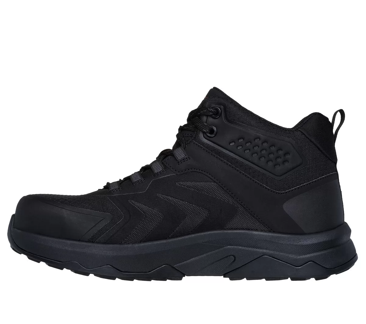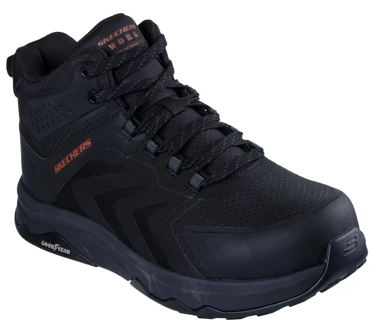 Genießen Sie Komfort und Schutz mit dem Skechers Work™: Speed-Flex Trekker. Dieser rutschfeste High-Top verfügt über ein Obermaterial aus Synthetik und Mesh mit Schnürung vorne, eine nichtmetallische Carbon-Nano-Sicherheitskappe, eine Skechers Air-Cooled Memory Foam®-Innensohle und eine Goodyear®-Gummilaufsohle.