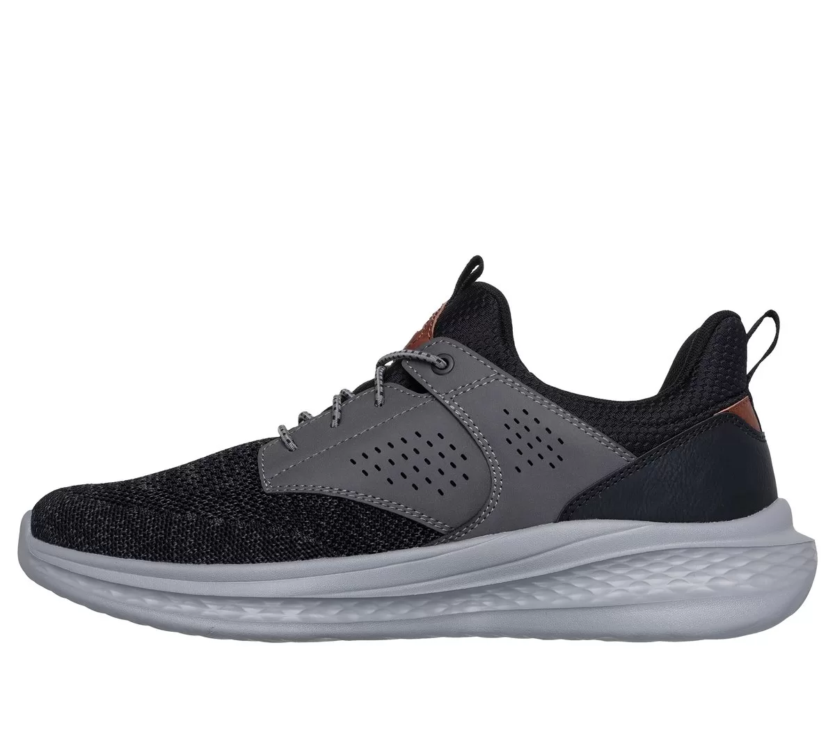 Klassisch moderner Stil vereint sich mit Komfort im Skechers Relaxed Fit®: Slade – Breyer. Dieses vegane Modell mit Stretch-Schnürsenkeln verfügt über ein Obermaterial aus Mesh und Synthetik mit einer mit Aktivkohle angereicherten Skechers Air-Cooled Memory Foam®-Einlegesohle und einem Skechers Goga Mat Arch™ für zusätzlichen Halt.